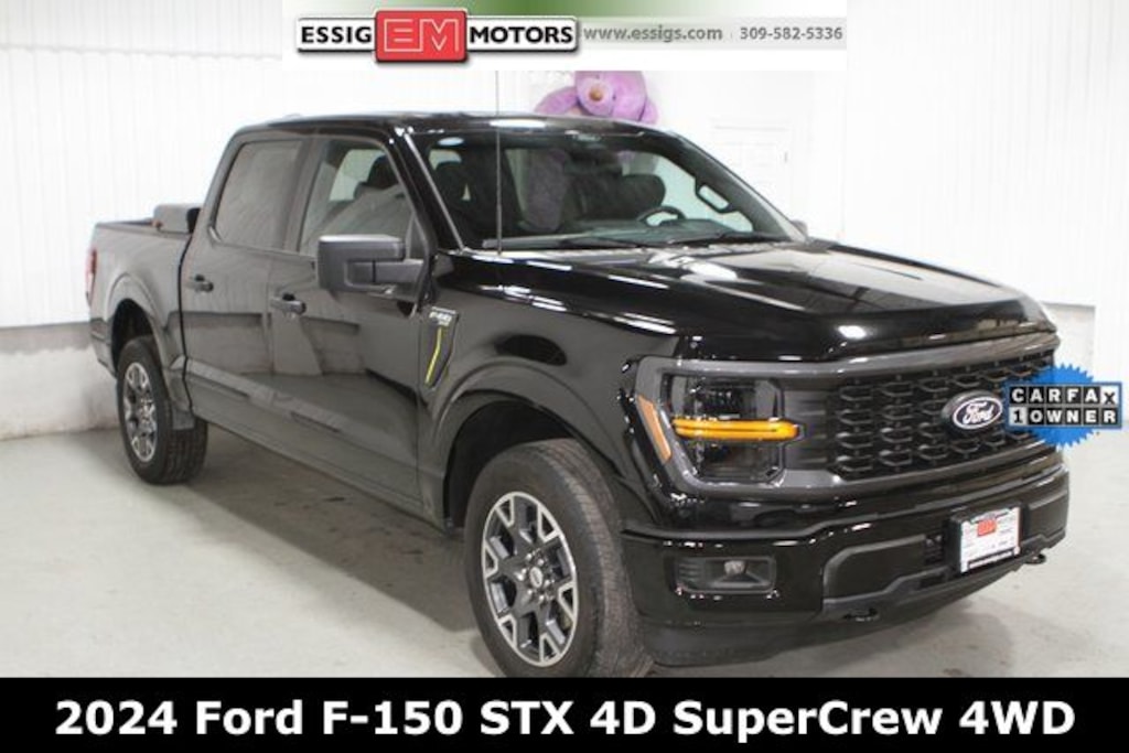 2024 Ford F-150 STX 4D SuperCrew 4WD Black Metallic **LOCAL TRADE, **ONE OWNER, **BACK-UP CAMERA**, **NAVIGATION, 2.7L V6 EcoBoost, Front Bucket Seats, Wheels: 20" Dark Gray w/Machined Aluminum. 18/23 City/Highway MPG Located in Aledo Illinois, Essig Motors has been family owned and operated since 1989. Owner Jim Essig's experience in the auto industry began in 1975 working for his father's dealership in Washington, Illinois. We are honored to serve Mercer county, surrounding areas, and our growing online community with new, certified pre-owned, pre-owned, and also new and pre-owned commercial vehicles. Essig Motors offers an exceptional selection of new cars, trucks and SUVs including Chevrolet, GMC, Chrysler, Jeep, Dodge and Ram. Our knowledgeable, friendly sales staff is here to answer your questions and help you find the vehicle that meets your needs today!